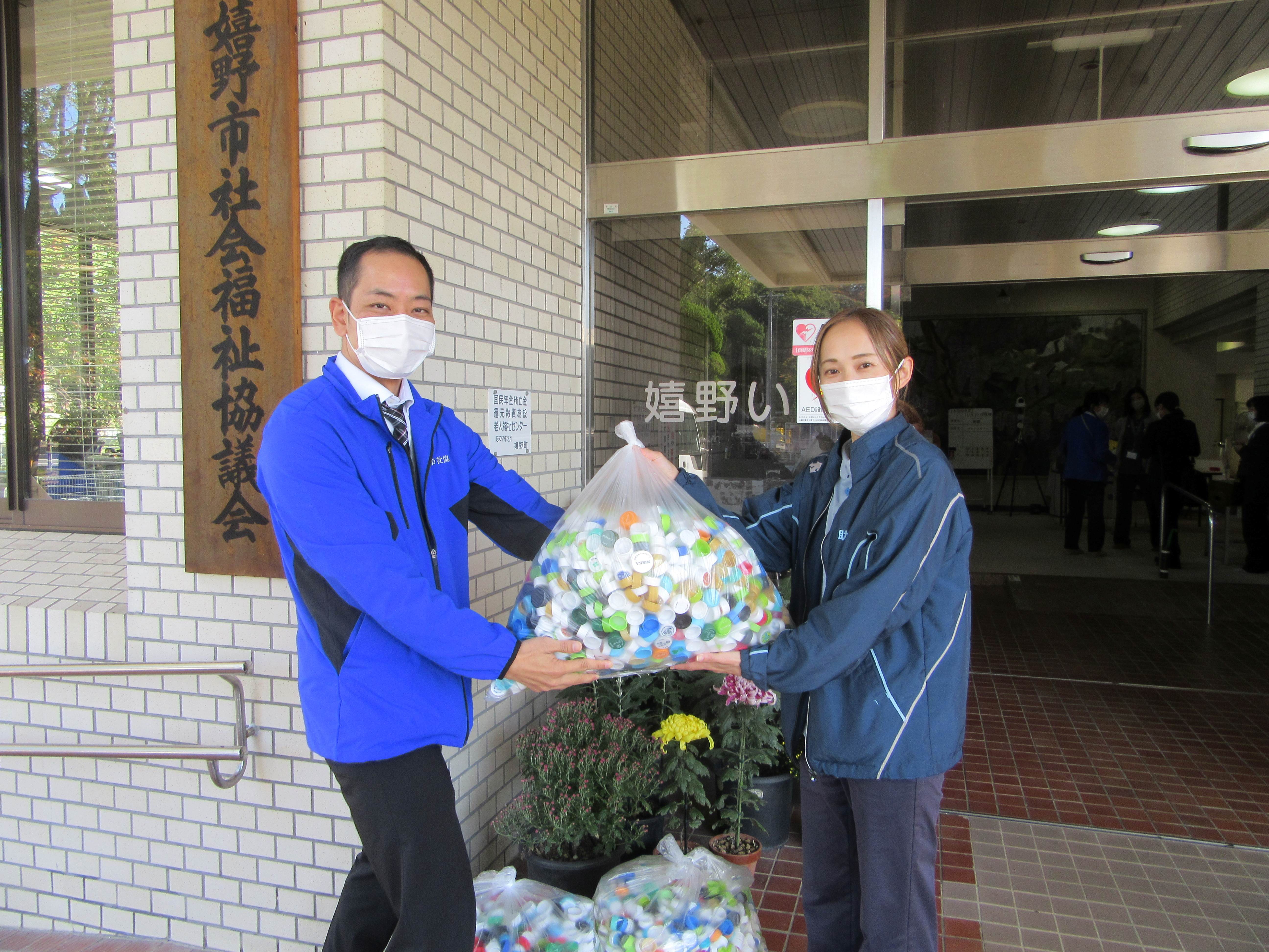ワクチン支援活動で、全職員で取り組んでいるペットボトルキャップが大袋3つ集まり、嬉野市社会福祉協議会様へもっていきました。